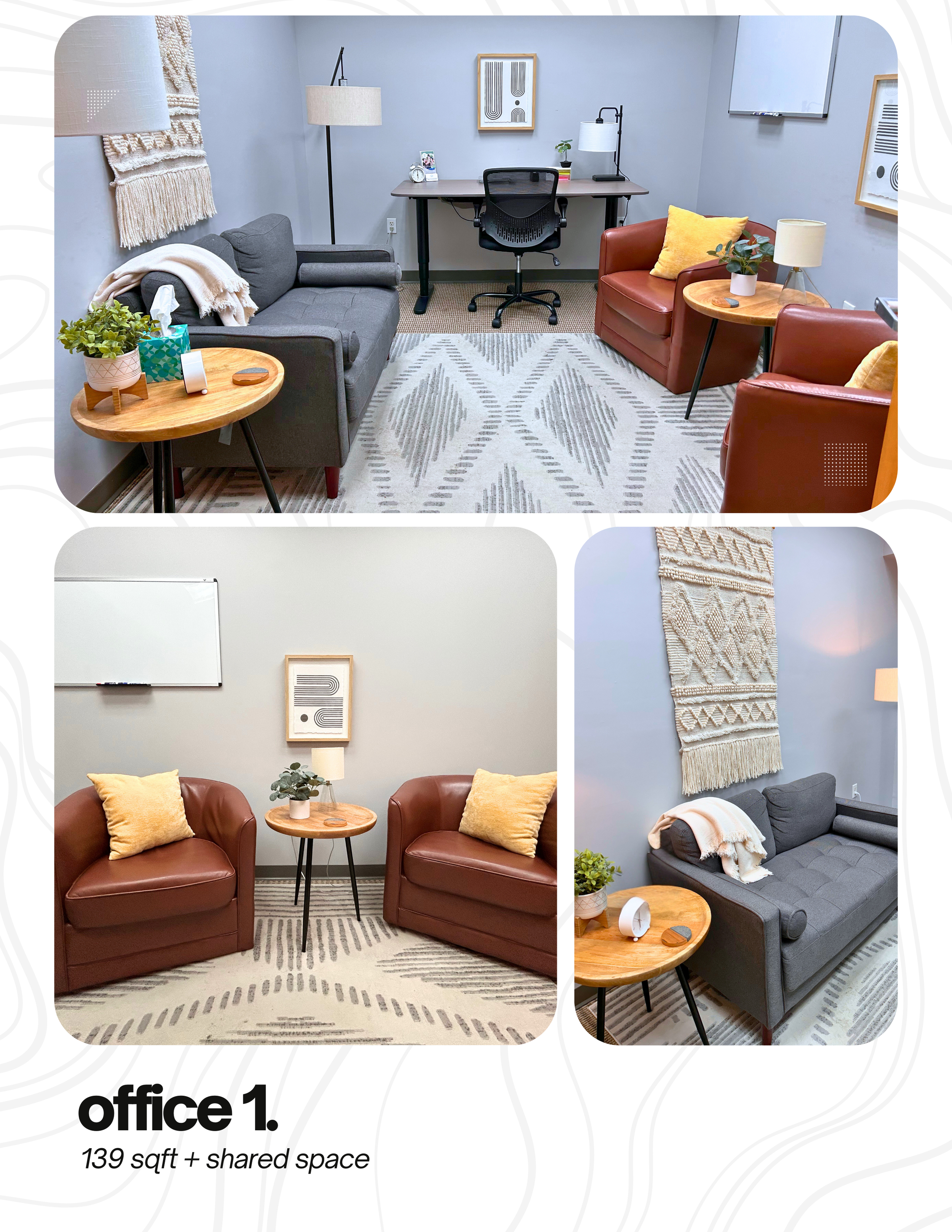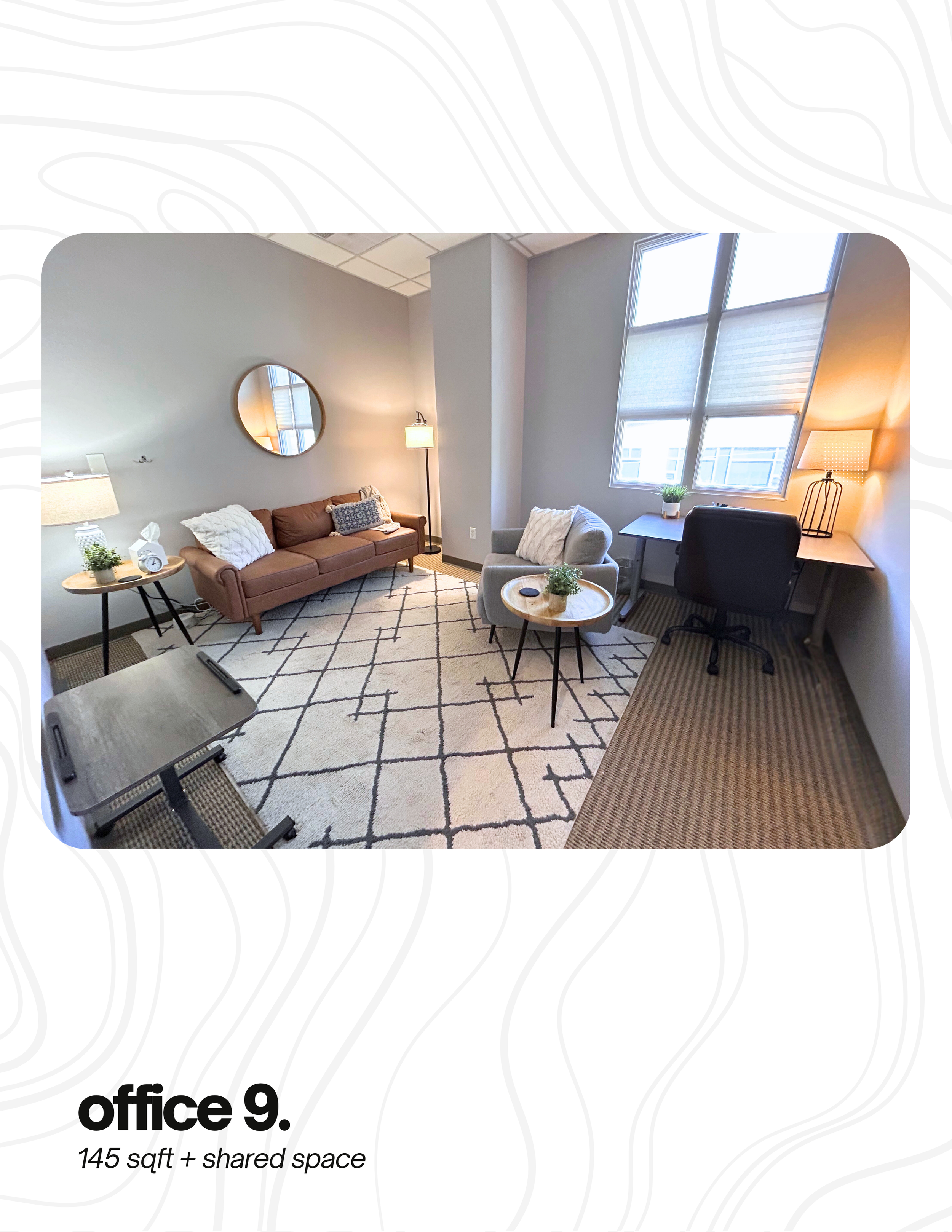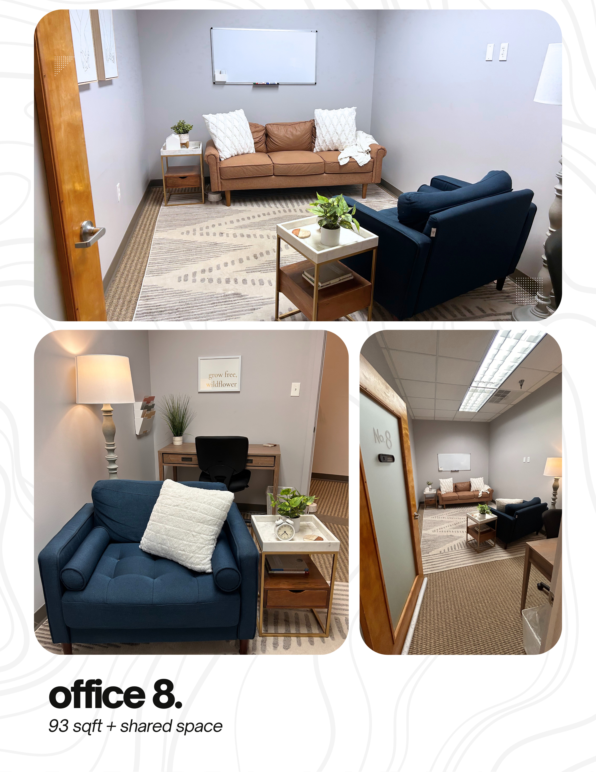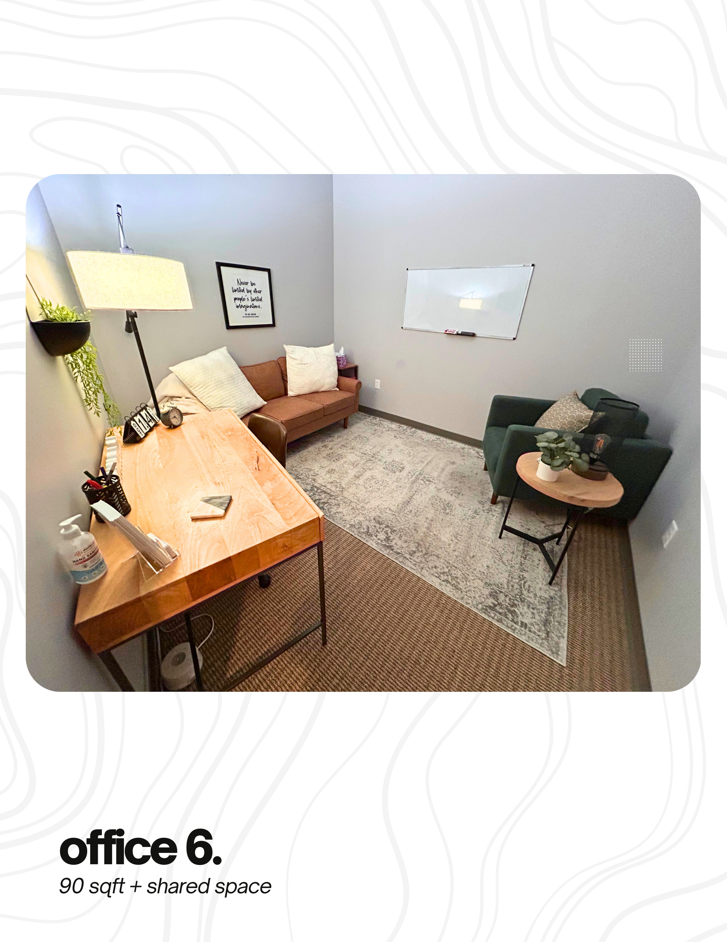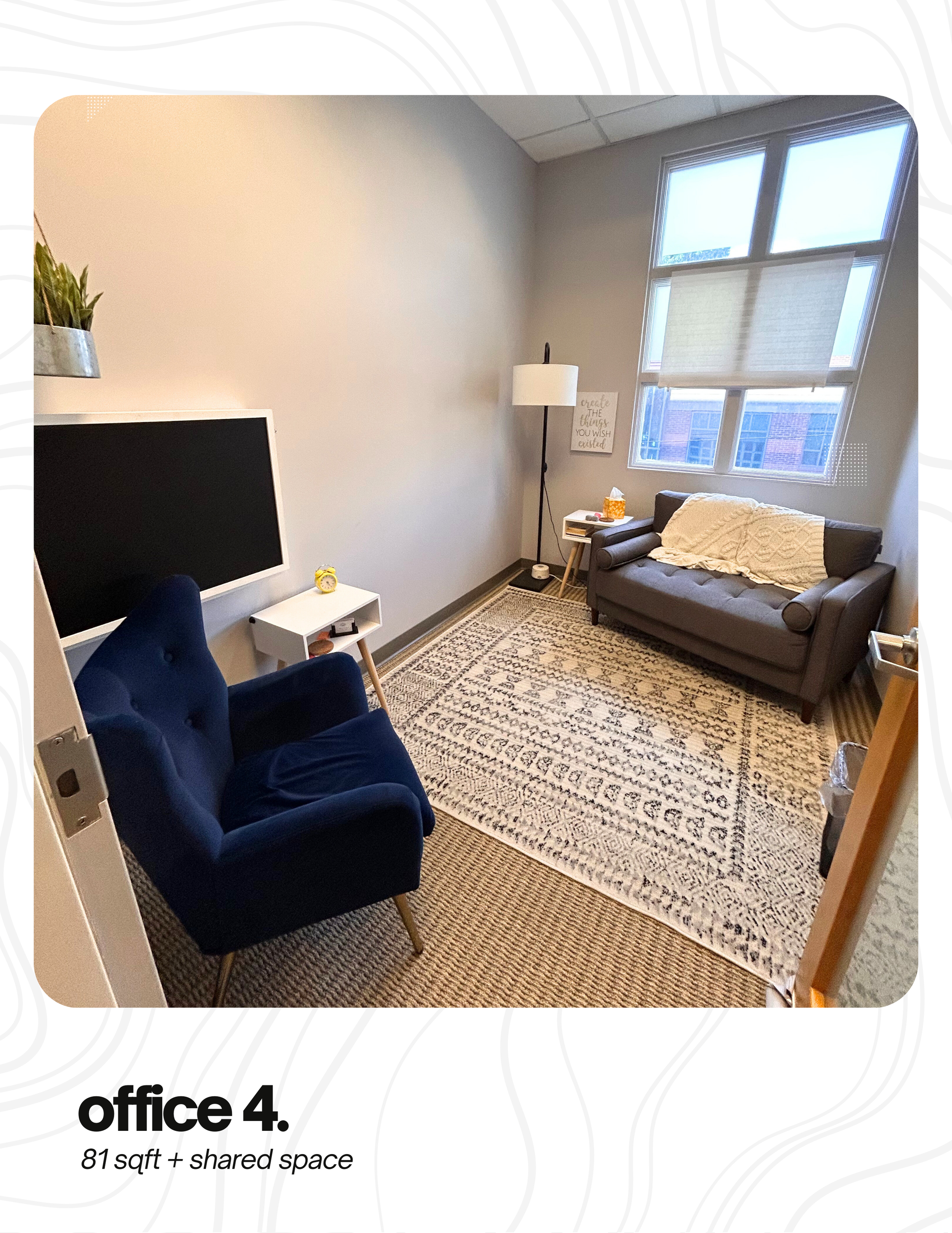 Turn key, professional office space with flexibility in layout and useโwith 571 sqft of shared amenities and a built-in network of values-aligned professionals.