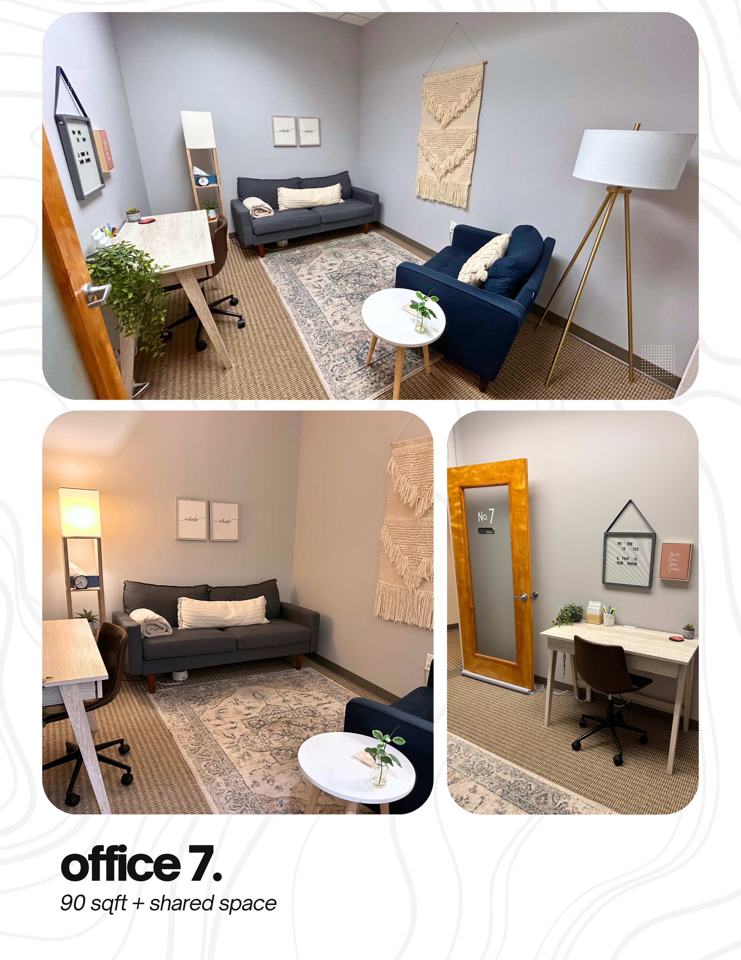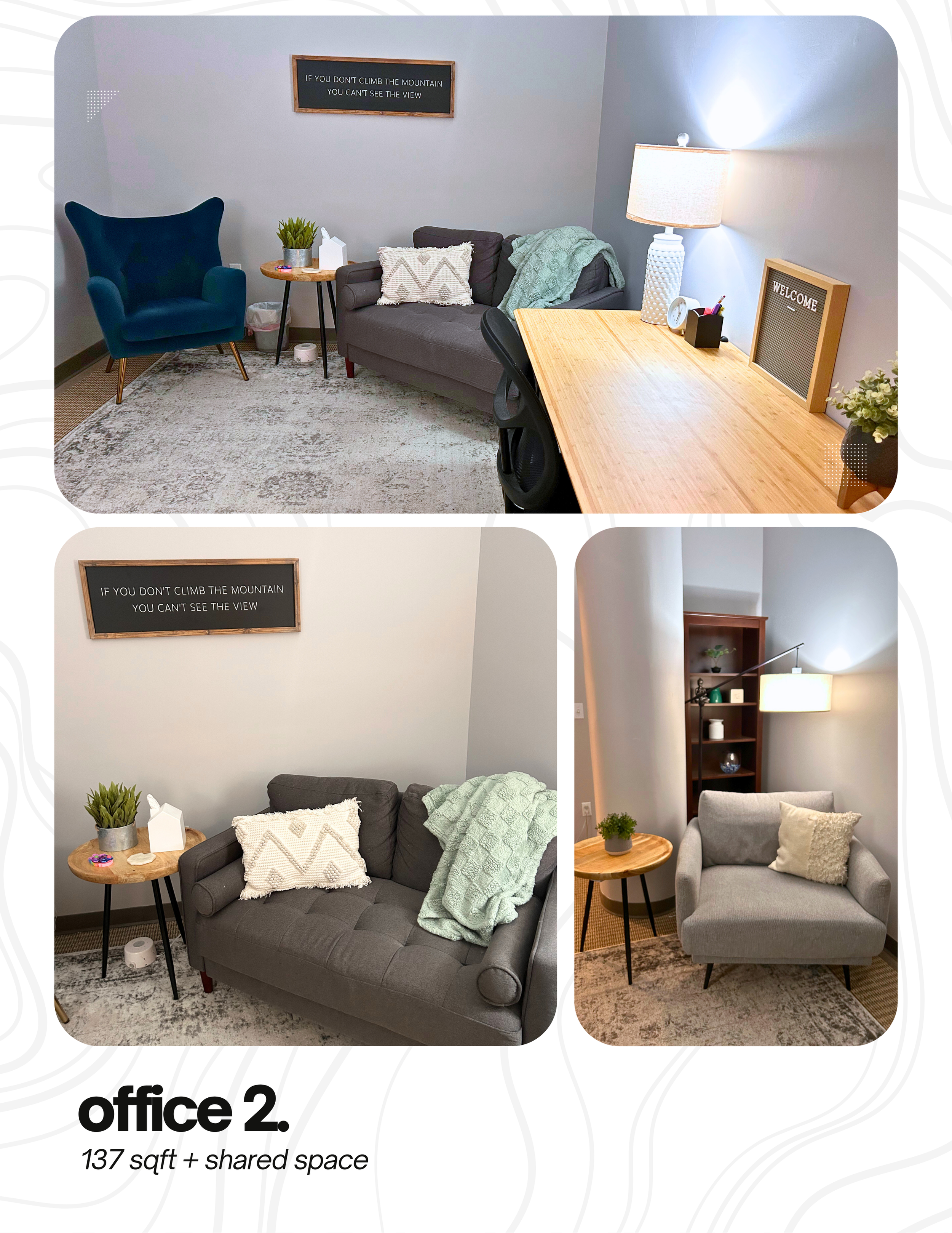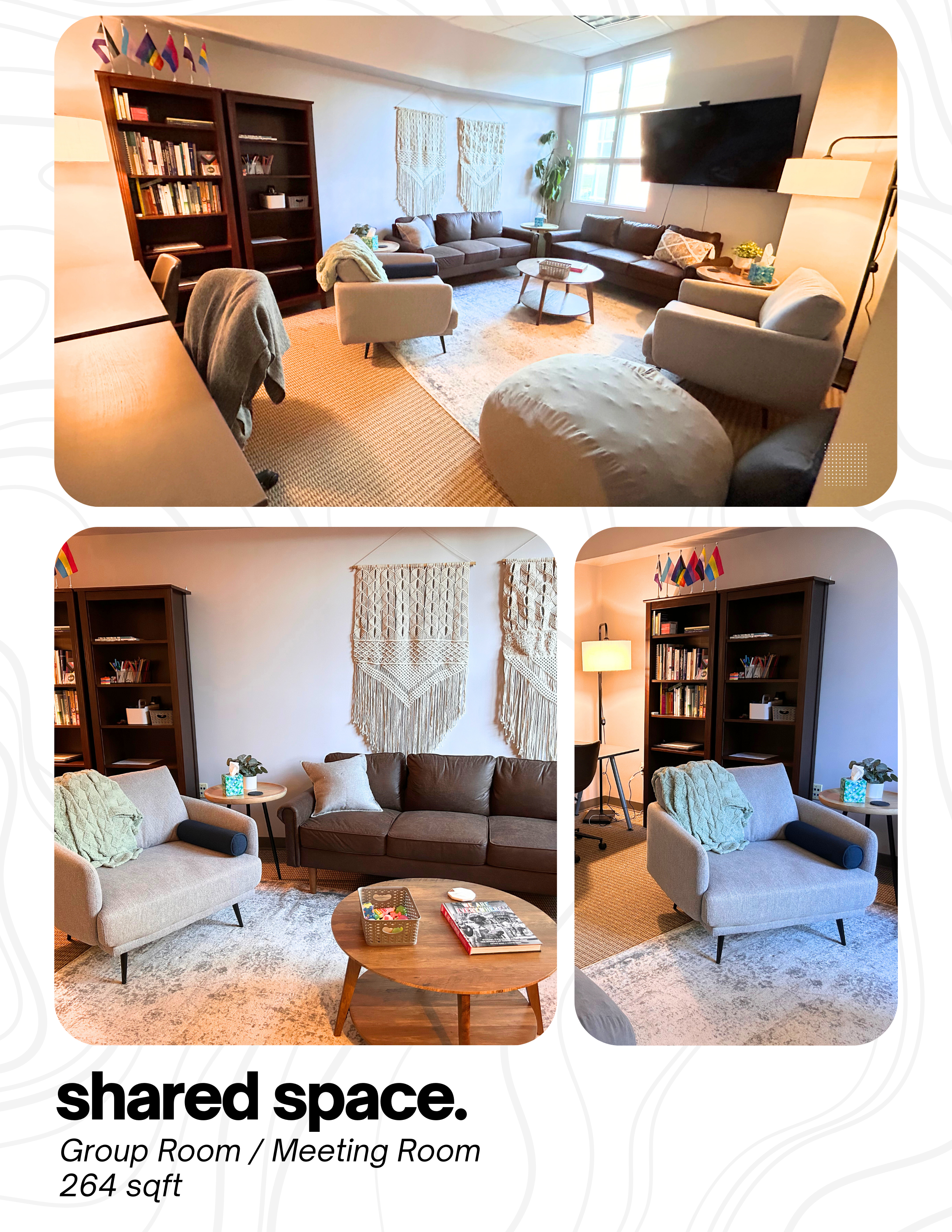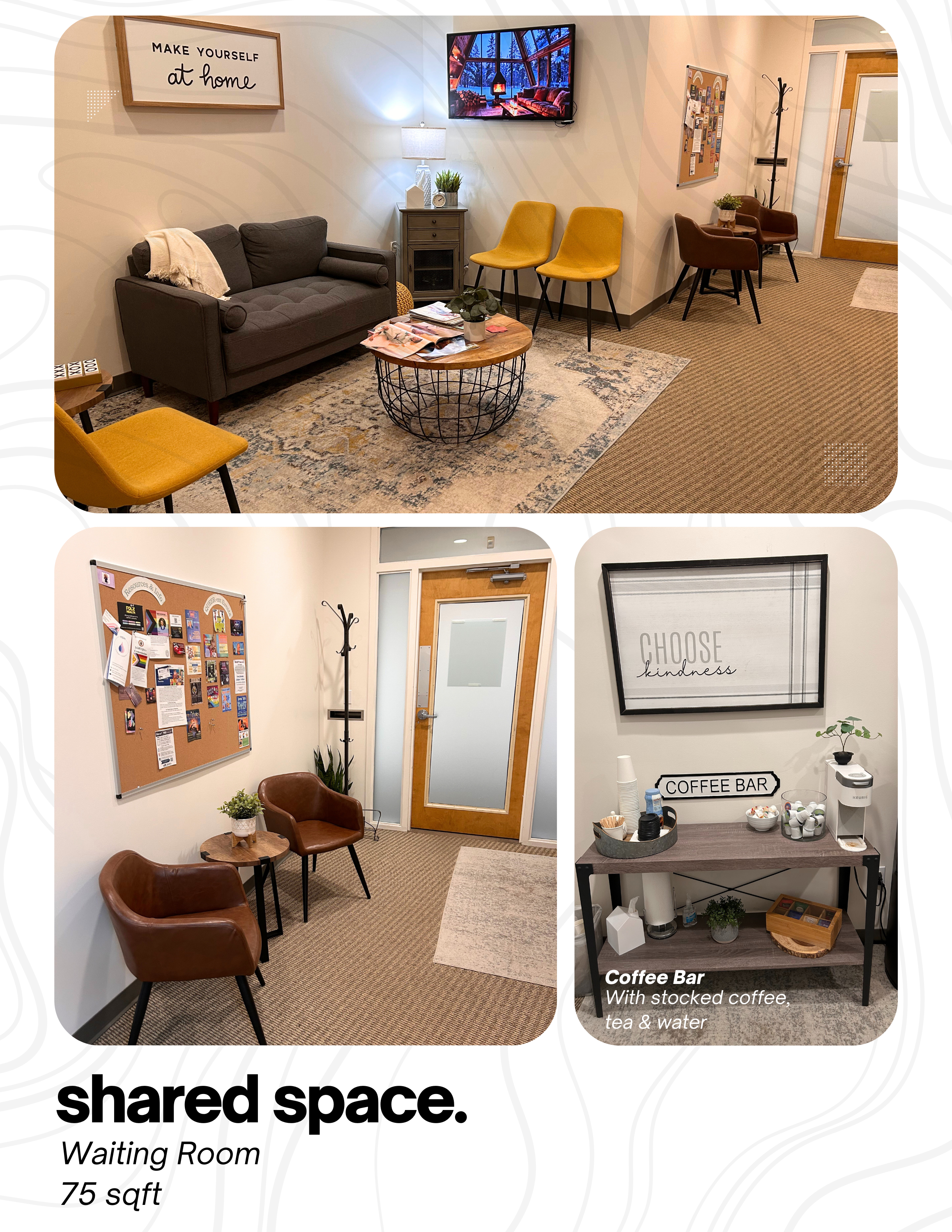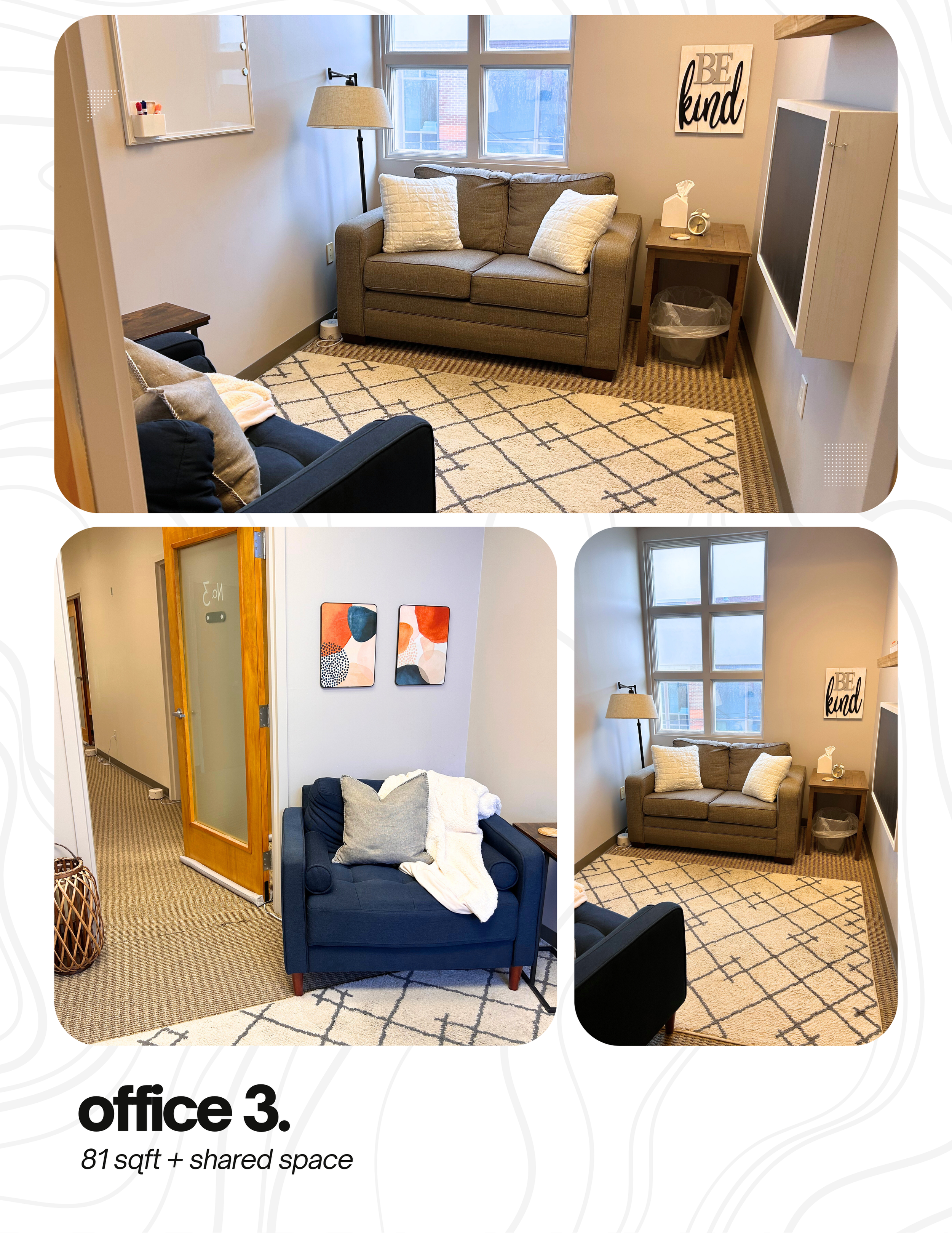 Turn key, professional office space with flexibility in layout and useโwith 571 sqft of shared amenities and a built-in network of values-aligned professionals.