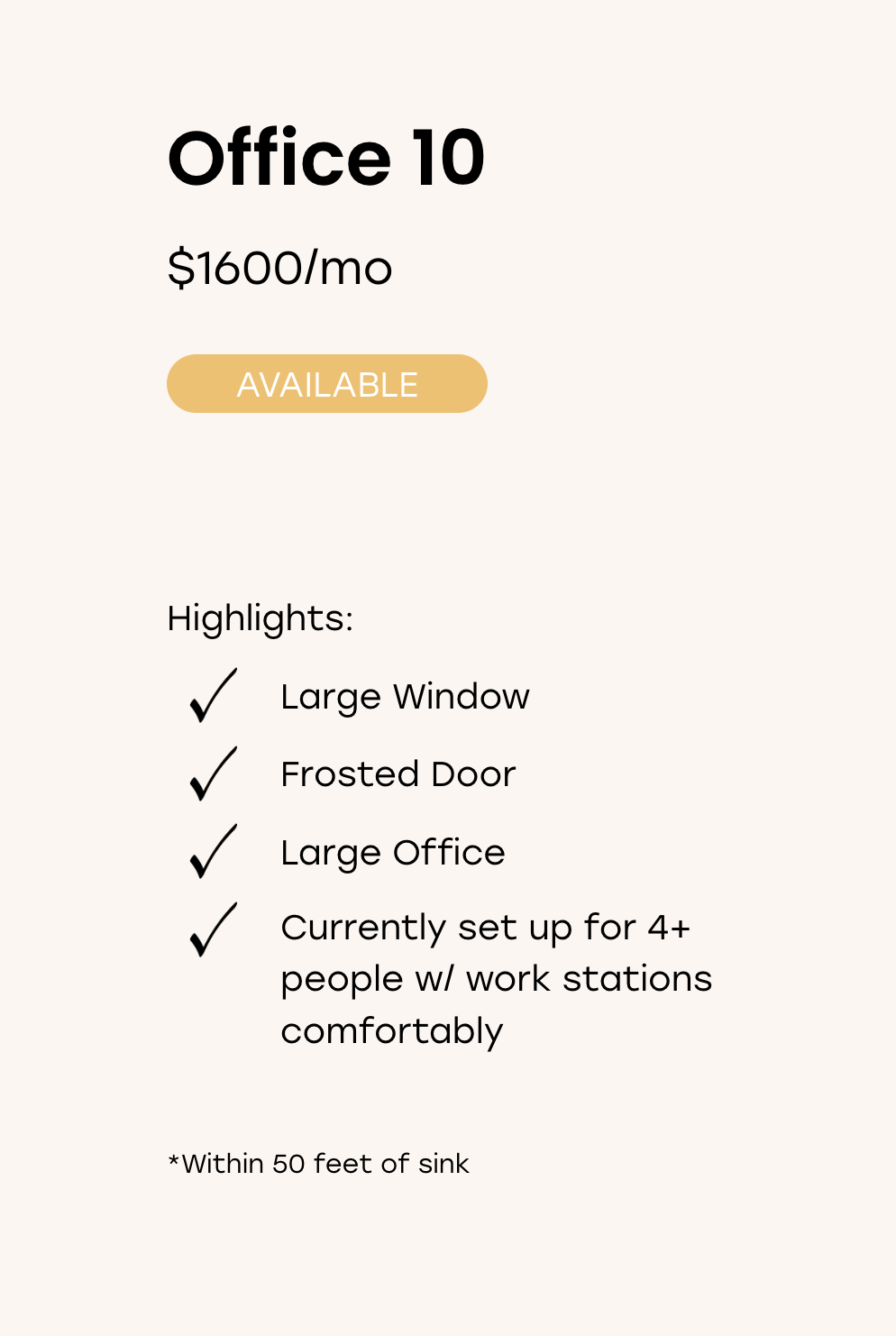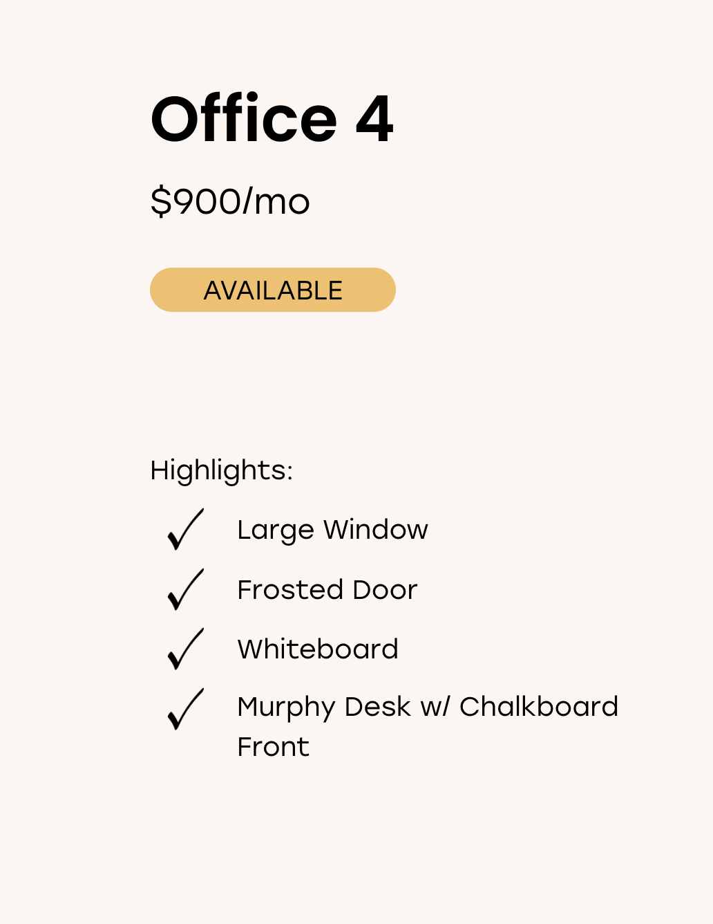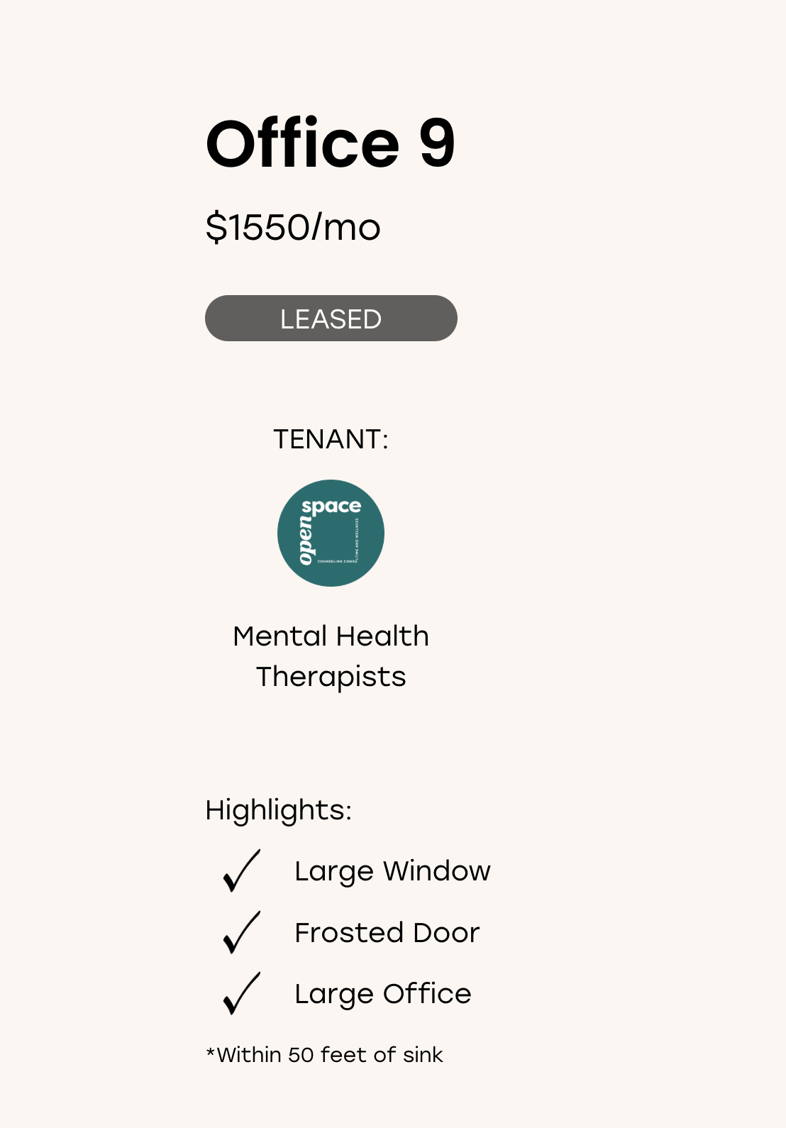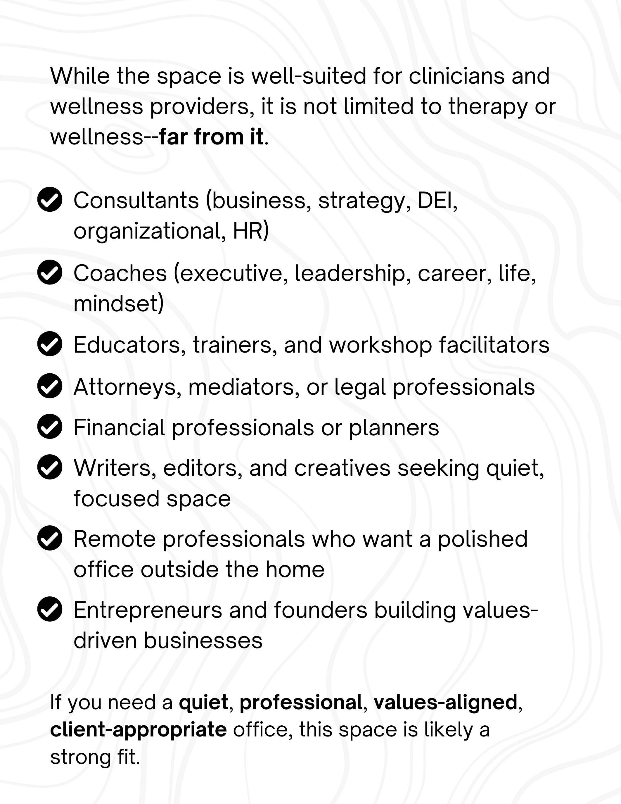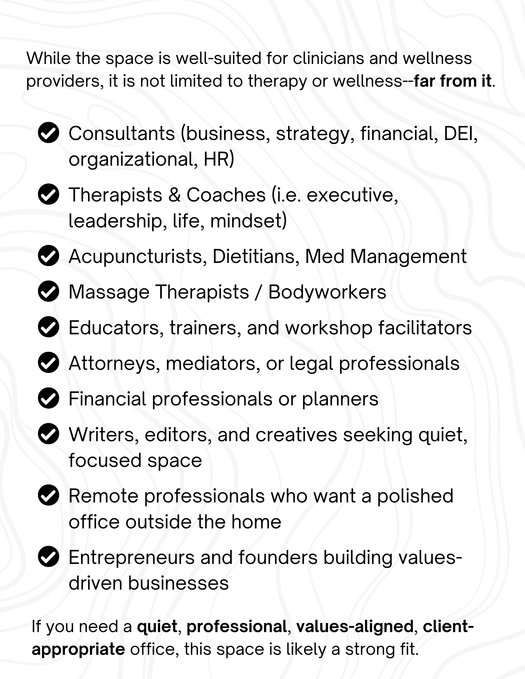 Turn key, professional office space with flexibility in layout and useโwith 571 sqft of shared amenities and a built-in network of values-aligned professionals.
